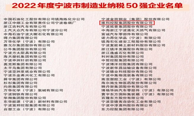 7月14日上午被譽(yù)為“寧波經(jīng)濟(jì)奧斯卡”的2022寧波創(chuàng)新創(chuàng)業(yè)風(fēng)云榜再次揭開(kāi)帷幕,維科集團(tuán)再次榮登納稅榜單,榮獲2022年度寧波市制造業(yè)納稅50強(qiáng)。
