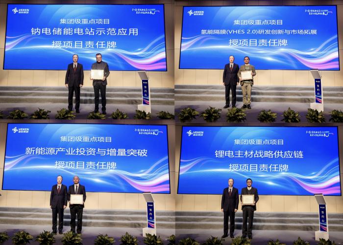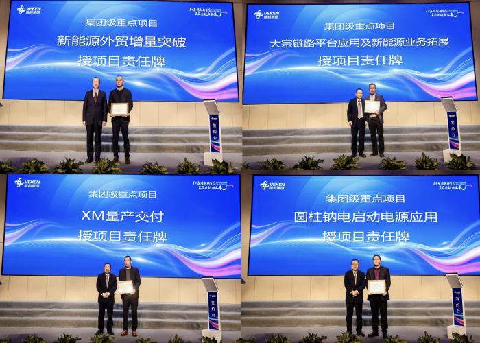 會上,鈉電儲能電站示范應(yīng)用、氫能隔膜( VHES 2.0)研發(fā)創(chuàng)新與市場拓展、新能源產(chǎn)業(yè)投資與增量突破、鋰電主材戰(zhàn)略供應(yīng)鏈、新能源外貿(mào)增量突破、大宗鏈路平臺應(yīng)用及新能源業(yè)務(wù)拓展、XM量產(chǎn)交付、圓柱鈉電啟動電源應(yīng)用等八個集團級重點項目的責任人從項目意義、項目目標、團隊成員、項目工作措施、項目存在風(fēng)險及應(yīng)對、項目里程碑節(jié)點、項目資源需求等方面對項目進行了解碼發(fā)布。集團考薪委主任陳總,高新董事長、維科技術(shù)考薪委主任呂總對重點項目分別作了對賭考核要求,項目責任人簽署了責任狀,并授予了重點項目責任牌。