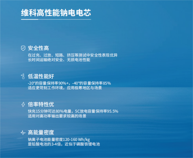 維科技術(shù)為本項(xiàng)目交付的鈉離子電池,容量為230Ah,具備安全性高、倍率性能高和循環(huán)壽命長(zhǎng)等突出優(yōu)勢(shì),即使在零下40℃時(shí)仍能保持近85%的容量,在多個(gè)儲(chǔ)能和動(dòng)力應(yīng)用場(chǎng)景中取得了良好的市場(chǎng)反響。目前,維科鈉電已完成了能量密度160Wh/kg、循環(huán)次數(shù)超6000次的新一代鈉離子電池技術(shù),性能指標(biāo)繼續(xù)領(lǐng)先業(yè)界,并將很快投入量產(chǎn)。