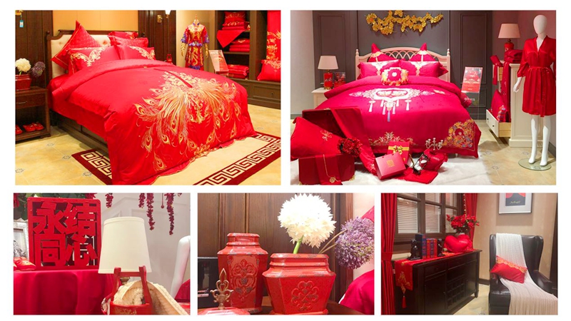 為帶給顧客更直觀舒適的消費(fèi)體驗(yàn),在空間設(shè)計(jì)上,維科家紡和義店二樓婚慶家紡場(chǎng)景展示區(qū)摒棄了家紡行業(yè)傳統(tǒng)高柜+展床以求陳列面最大化的方式,將300余平方的空間分隔成7個(gè)實(shí)景樣板間,真實(shí)體現(xiàn)婚慶床品在日常家居生活中的應(yīng)用效果,也能滿足顧客在選購(gòu)婚慶床品的同時(shí),一站式解決對(duì)婆婆禮、長(zhǎng)輩禮以及婚慶小件(子孫桶、火銃、虎頭鞋等)的需求。該區(qū)域設(shè)置了一大一小兩個(gè)洽談區(qū),配備了舒適的沙發(fā)以及精致的茶歇,以供顧客能夠坐下來向?qū)з?gòu)詳細(xì)了解床品的信息,以優(yōu)質(zhì)的消費(fèi)體驗(yàn),滿足顧客的選購(gòu)需求。在陳列布置上,當(dāng)季新品醉紅妝、子孫滿堂、胭脂醉,熱銷品百子納福、麒麟賀滿堂等都直接鋪設(shè)于房間內(nèi),并搭配生活化的情景道具,供顧客選購(gòu)。