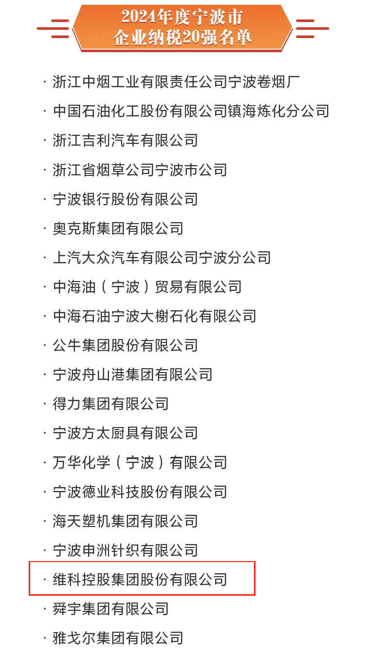6月13日、2025年寧波市 「科學(xué)技術(shù)革新と産業(yè)革新の深い統(tǒng)合を促進し、民間経済の質(zhì)の高い発展を加速するための會議 」と 「2025寧波起業(yè)家精神とイノベーションリスト 」リスト発表活動が開催され、維科グループは、「2024寧波納稅トップ20企業(yè) 」賞を受賞した?!?024年寧波納稅トップ20企業(yè) 」を獲得した。