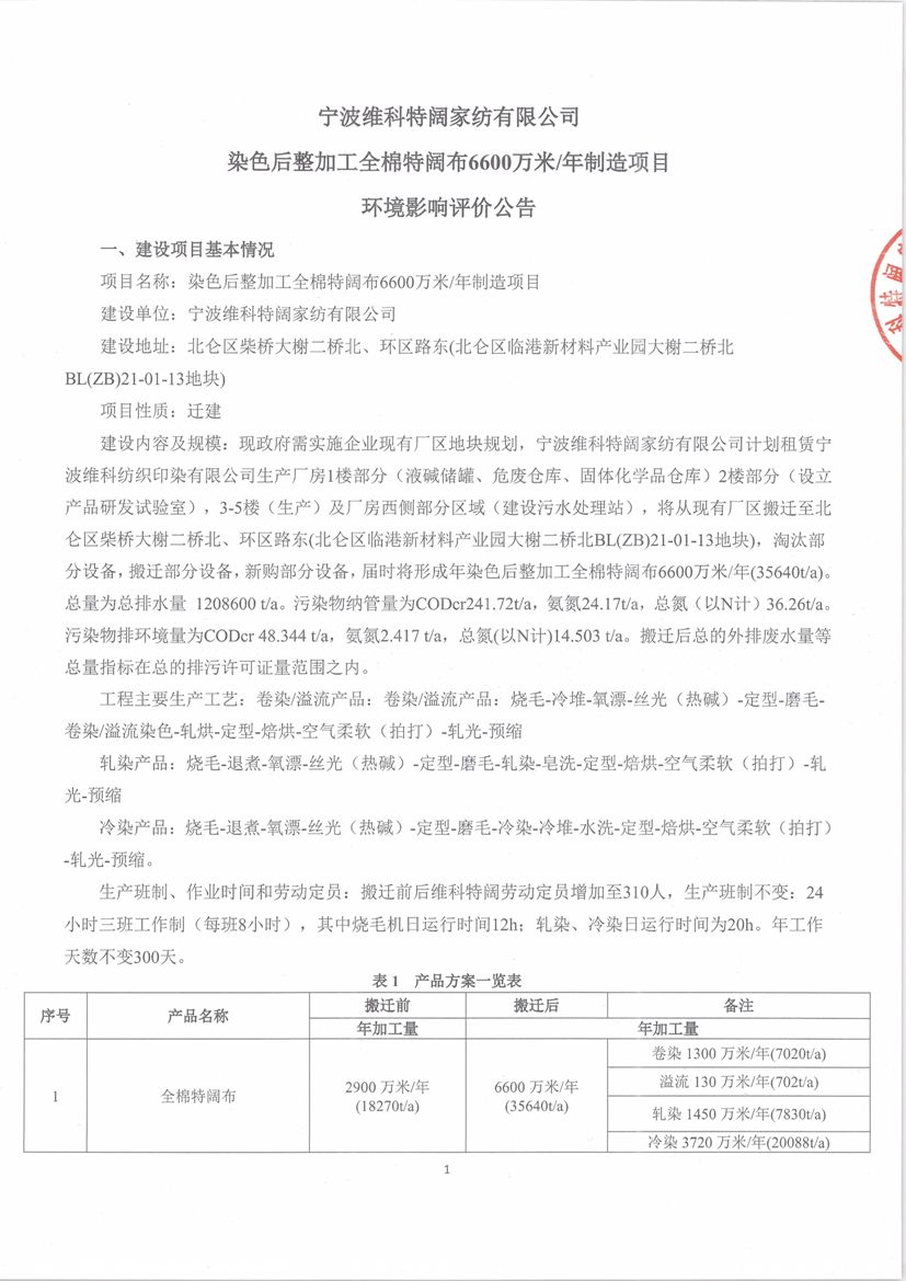 我公司的《寧波維科特闊家紡有限公司染色后整加工全棉特闊布6600萬米/年制造項(xiàng)目環(huán)境影響報(bào)告書》已完成編制,根據(jù)《浙江省建設(shè)項(xiàng)目環(huán)境保護(hù)管理辦法》(2021年修正)(省政府令第388號),現(xiàn)對項(xiàng)目主要內(nèi)容進(jìn)行公示。